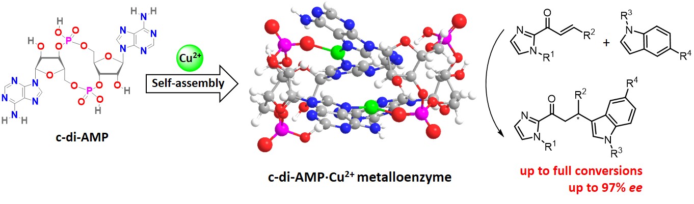功能材料表界化学研究团队在环二核苷酸人工金属酶具有手性催化功能方面取得重要进展。人工金属酶是一类新型的生物杂化催化剂,它通过将金属物种引入到生物大分子(蛋白质和核酸等)的骨架结构中,实现生物催化和金属催化的相结合,旨在拓展金属/生物催化的反应类型和发掘生物分子的新功能。除了蛋白质作为手性骨架,DNA被广泛用于组装人工DNA金属酶,高效实现了一系列水相中的不对称反应。由于RNA容易降解并且结构不稳定,关于人工RNA金属酶的手性催化研究还很少。因此,开发稳定、高效的人工RNA金属酶成为人工金属酶的研究热点。