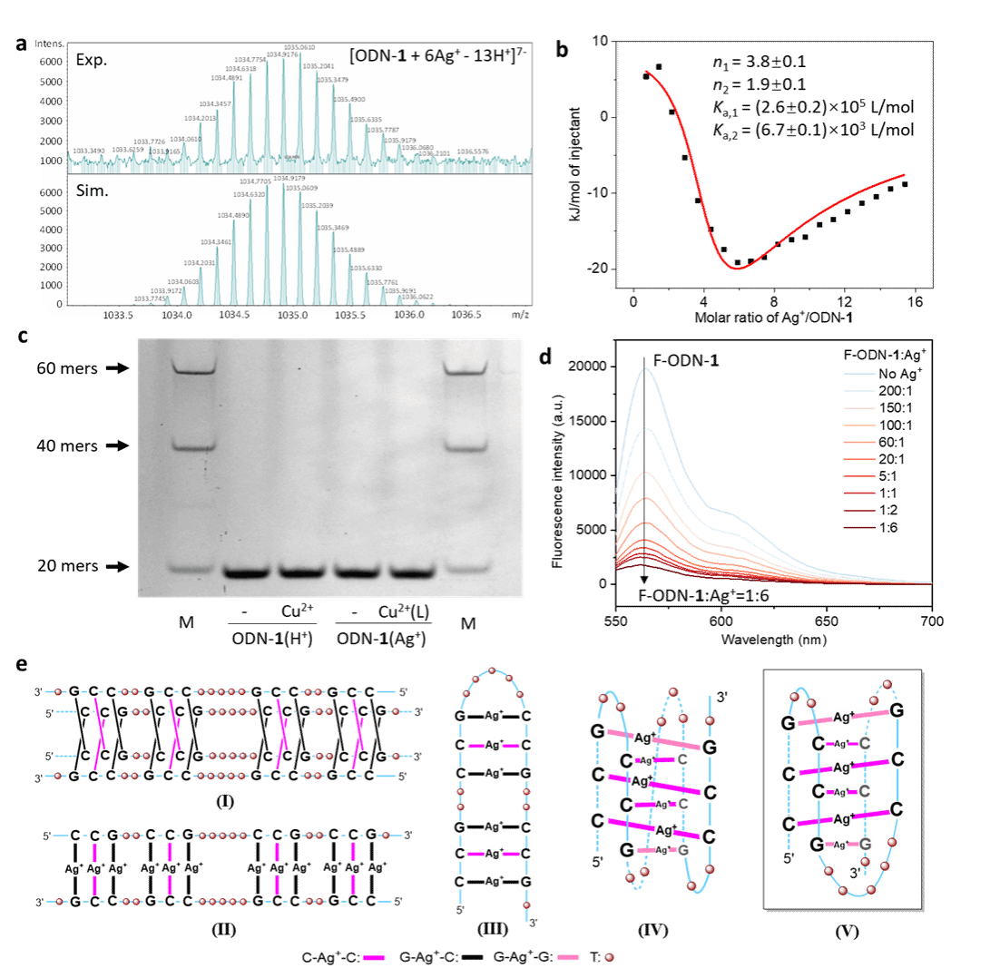 为揭示ODN-1(Ag+)的配位结构,进行了质谱(MS)和等温滴定量热(ITC)(图3a-b)。鉴于ODN-1序列包含8个胞嘧啶和4个鸟嘌呤,提出了6个Ag+离子在ODN-1(Ag+)内形成了4个C−Ag+−C和2个G−Ag+−G碱基对。为探究ODN-1的折叠拓扑结构,采用了聚丙烯酰胺凝胶电泳(PAGE)技术(图3c),说明ODN-1(H+)和ODN-1(Ag+)均是分子内折叠的拓扑结构。为探究DNA的构象变化,进行了荧光共振能量转移(FRET)检测(图3d),实验结果表明Ag+加入造成ODN-1(H+)的5’端和3’端靠近。最后,基于全面的表征数据推测ODN-1(Ag+)的结构最可能为模型V(图3e)。