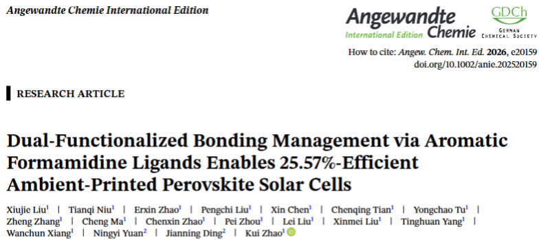 本工作为大气环境印刷制备钙钛矿光伏器件提供了一种行之有效的材料设计与结晶动力学调控方法。通过双重化学键合策略,同步解决了环境兼容性、结晶控制与薄膜放大制备难题,为推进钙钛矿光伏技术的低成本、产业化发展提供了新思路。相关研究工作以“Dual-Functionalized Bonding Management via Aromatic Formamidine Ligands Enables 25.57%-Efficient Ambient-Printed Perovskite Solar Cells”为题,发表于国际顶级期刊《Angewandte Chemie International Edition》。2023级硕士研究生刘秀洁为论文第一作者,牛天启博士和赵奎教授为共同通讯作者(论文链接:https://onlinelibrary.wiley.com/doi/10.1002/anie.202520159)。