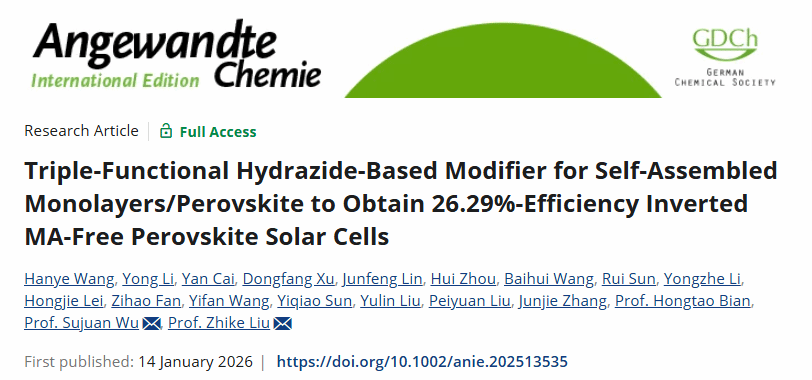 该工作得到了陕西省杰出青年科学基金(2025-JCJQN-004)、广东省光学信息材料与技术重点实验室、广州市科技计划项目(202201000008)、陕西师范大学中央高校基本科研业务费(GK202302005),以及陕西师范大学材料科学与工程学院青年科学家启动项目(2024YSIP-MSE-SNNU002,2023YSIP-MSE-SNNU012)等项目支持。相关成果以“Triple-Functional Hydrazide-Based Modifier for Self-Assembled Monolayers/Perovskite to Obtain 26.29%-Efficiency Inverted MA-Free Perovskite Solar Cells”为题发表于国际著名期刊Angewandte Chemie International Edition上。2023级硕士研究生王涵叶为第一作者,通讯作者为刘治科教授和华南师范大学吴素娟副教授。